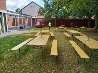 Dank sagen wir auch der Emmauskirchengemeinde für die Erlaubnis, ihren Platz zwischen Kirche und Gemeindehaus zu nutzen, der sich für das gemeinsame Grillen bestens eignet, zumal auch die sanitären Anlagen des neuen Gemeindehauses genutzt werden durften.